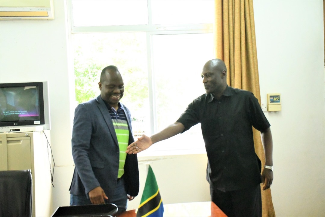 Mkuu wa Wilaya ya Mvomero Mhe. Albinius Mugonya (kulia) akimkaribisha ofisini kwake Katibu Mkuu Wizara ya Kilimo Bw.Gerald Kusaya ( kushoto) leo alipoanza ziara ya kikazi wilaya ya Mvomero kukagua skimu za umwagiliaji chini ya mradi wa ERPP.