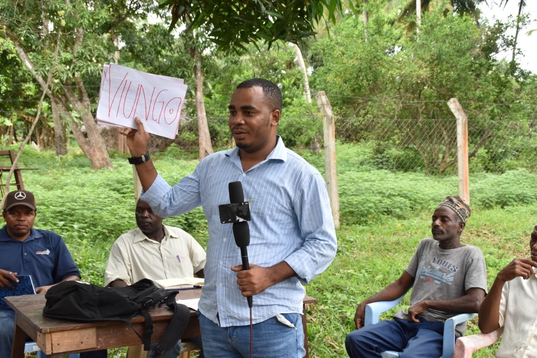 Afisa uhusiano mradi wa Viungo Zanzibar Muhammed Khamis akizungumza na wananchi wa Shehia ya Mtende mkoa wa kusini Unguja wakati wa utowaji wa elimu juu ya kilimo bora kupitia mradi huo ambao umefadhiliwa na umoja wa Ulaya (EU)