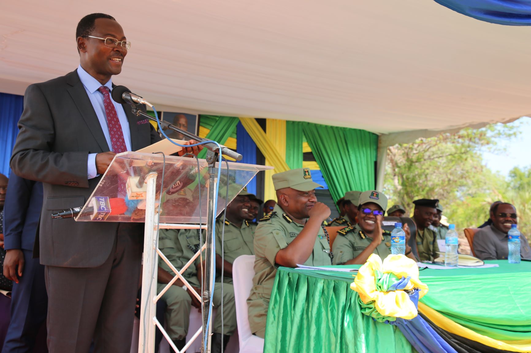WAZIRI wa Mambo ya Ndani ya Nchi, George Simbachawene akizungumza wakati akifungua mafunzo ya uongozi kwa maafisa na askari wa uhamiaji katika kambi mpya ya Boma Kichaka Miba, iliyopo Wilayani Mkinga, Mkoa wa Tanga, leo. Amesema askari watakaoshindwa kuwabaini Wahamiaji haramu hususani maeneo ya mipakani wanapoingilia watawajibishwa. Kulia ni Mkuu wa Mkoa huo, Martine Shigela, na wapili kulia ni Kamishna Jenerali wa Uhamiaji, Dkt. Anna Makakala.