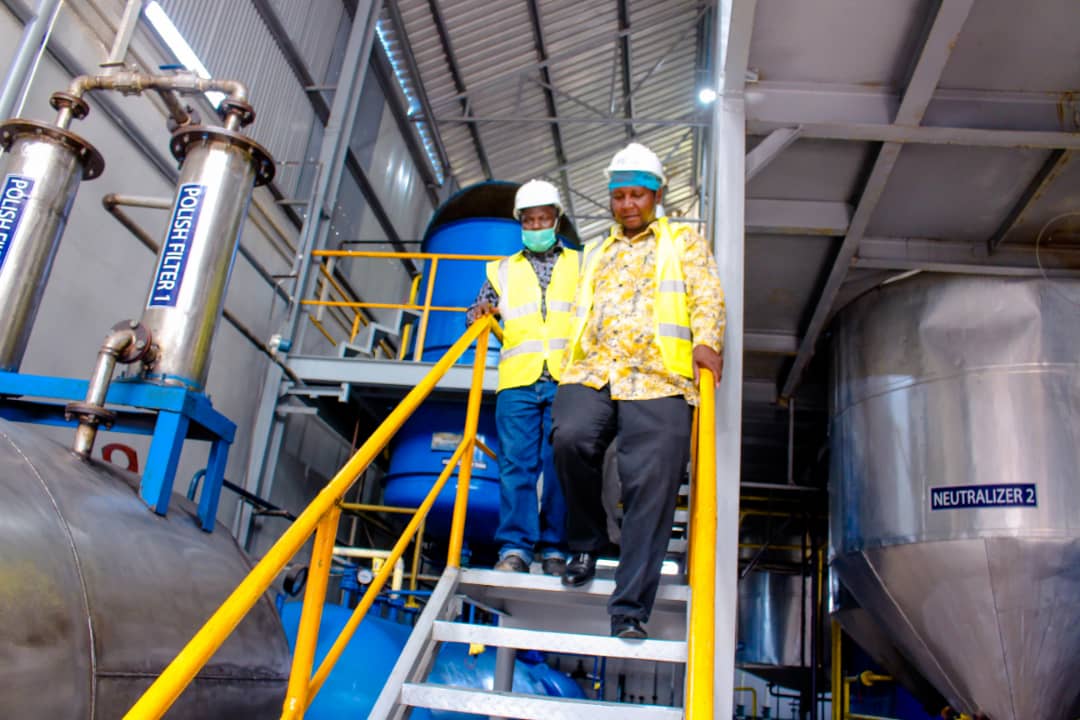 Waziri wa Kilimo, Prof Adolf Mkenda akikagua uzalishaji wa mafuta katika kiwanda cha Pyxus kilichopo jijini Dodoma alipokitembelea leo Januari 22,2021.