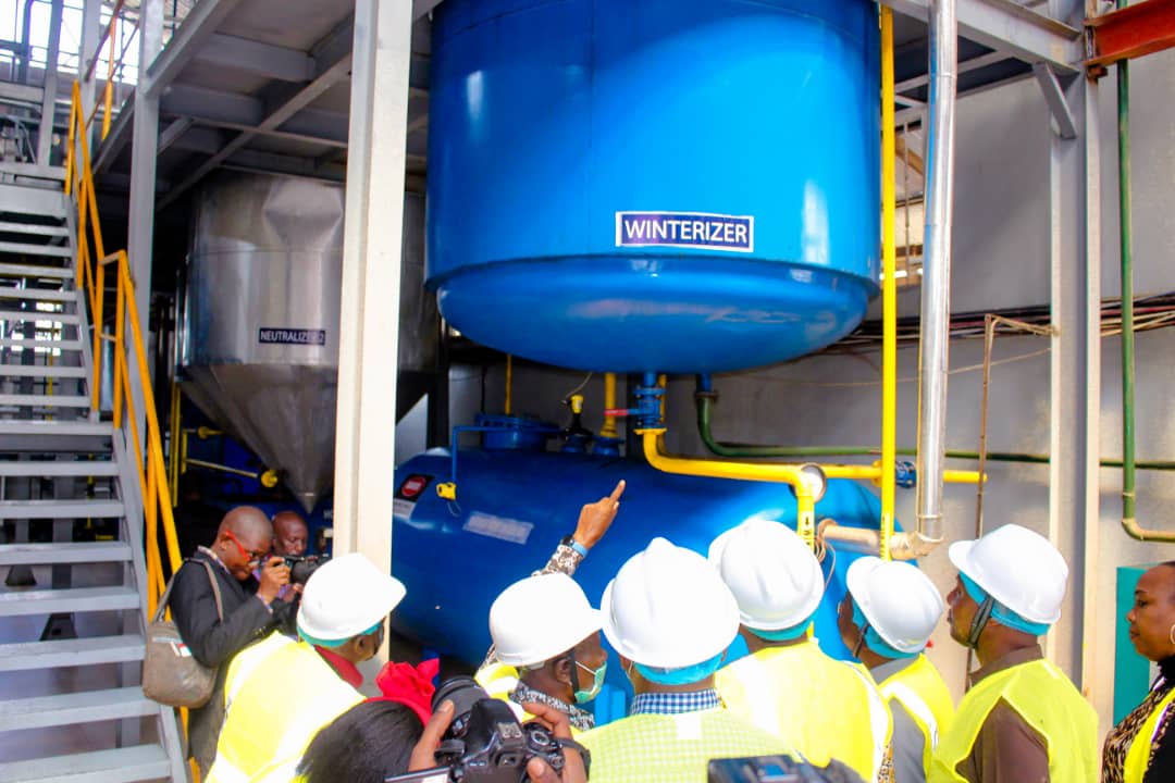 Waziri wa Kilimo, Prof Adolf Mkenda akipatiwa maelezo ya uzalishaji wa mafuta katika kiwanda cha Pyxus kilichopo jijini Dodoma alipofanya ziara ya kukitembelea leo Januari 21,2021.