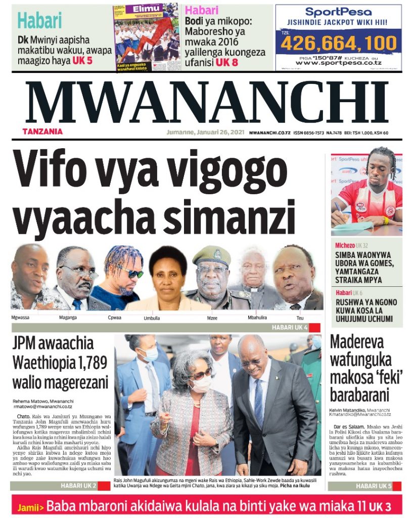 MagazetiPITIA VICHWA VYA HABARI KATIKA MAGAZETI YA LEO JANUARY 26,2021 Last updated: 2021/01/26 at 3:33 AM Alex Sonna 5 years ago Share SHARE Alex Sonna January 26, 2021 January 26, 2021 Share this Article Facebook Twitter Email Print Previous Article TMDA YAITAKA JAMII KUACHA MARA MOJA UTEKETEZAJI HOLELA WA DAWA ZISIZO SALAMA Next Article NAIBU WAZIRI BYABATO AIAGIZA TANESCO KUKAMILISHA UTENGENEZAJI WA MTAMBO NDANI YA WIKI MBILI