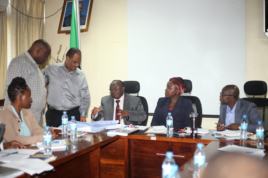 Makamu Mkuu wa Chuo Kikuu cha Ardhi Prof. Evaristo Liwa (wa tatu kutoka kulia) akisisitiza jambo kwa Menejimenti ya Wizara ya Ardhi wakati wa kikao cha pamoja cha kujadili kuhusu utekelezaji wa majukumu ya iliyokuwa Wakala wa Taifa wa Utafiti wa Nyumba Bora na Vifaa vya Ujenzi (NHBRA) kilichofanyika jijini Dar es Salaam. Kushoto kwake ni Katibu Mkuu Wizara ya Ardhi Bi. Mary Makondo na Naibu wake Bw. Nicholas Mkapa