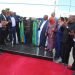 Magufuli akiwa na viongozi wengine akiweka jiwe la msingi la mradi wa