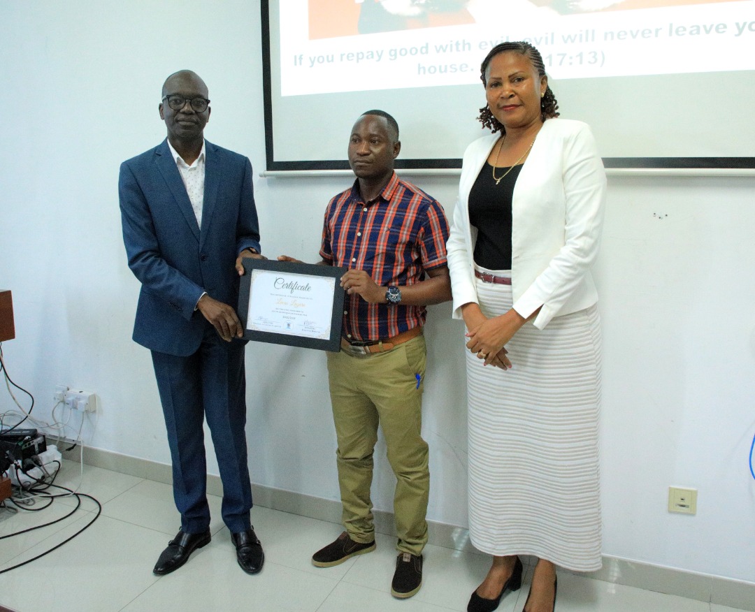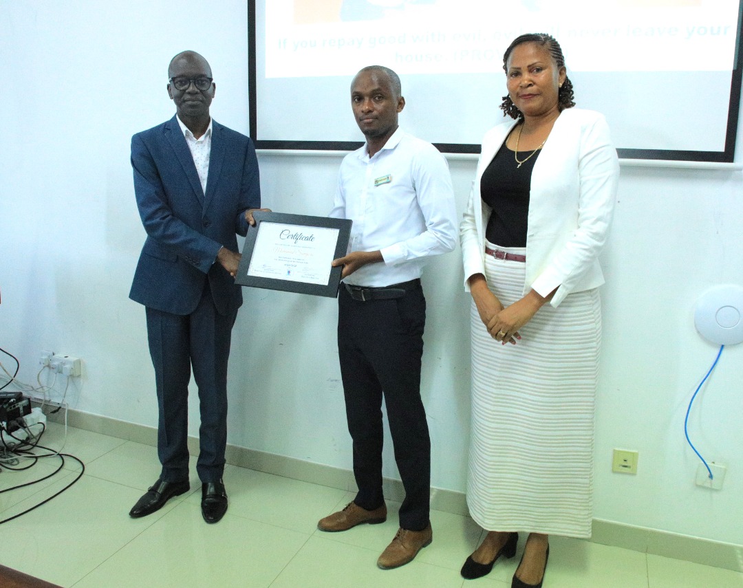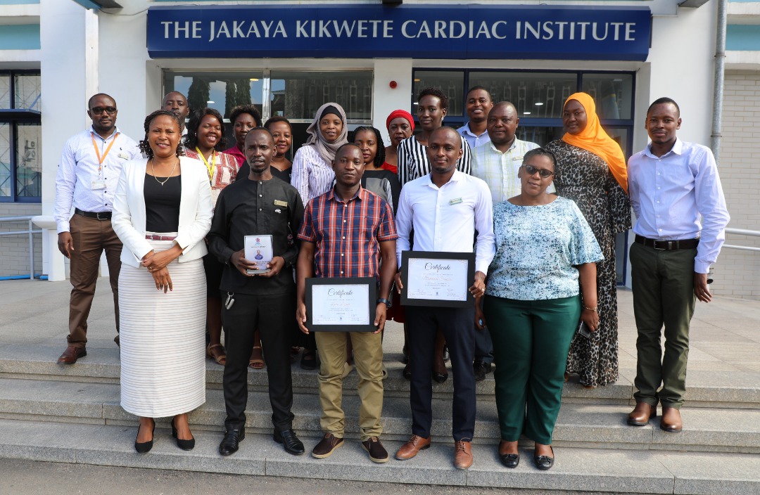 Mkurugenzi Mtendaji wa Taasisi ya Moyo Jakaya Kikwete (JKCI) Prof. Mohamed Janabi akimkabidhi cheti mfanyakazi bora wa robo ya pili ya mwaka wa fedha 2020/2021 aliyeshika nafasi ya tatu Lucas Jilulu wakati wa hafla fupi ya kuwapongeza wafanyakazi bora watatu iliyofanyika leo katika Taasisi hiyo. Mfanyakazi huyo pia alipewa zawadi ya fedha taslimu shilingi milioni moja.