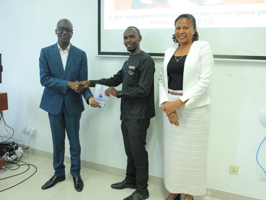 Mkurugenzi Mtendaji wa Taasisi ya Moyo Jakaya Kikwete (JKCI) Prof. Mohamed Janabi akimkabidhi zawadi ya ngao mfanyakazi bora wa robo ya pili ya mwaka wa fedha 2020/2021 aliyeshika nafasi ya kwanza Mtoka David Mtoka wakati wa hafla fupi ya kuwapongeza wafanyakazi bora watatu iliyofanyika leo katika Taasisi hiyo. Mfanyakazi huyo pia alipewa zawadi ya fedha taslimu shilingi milioni mbili