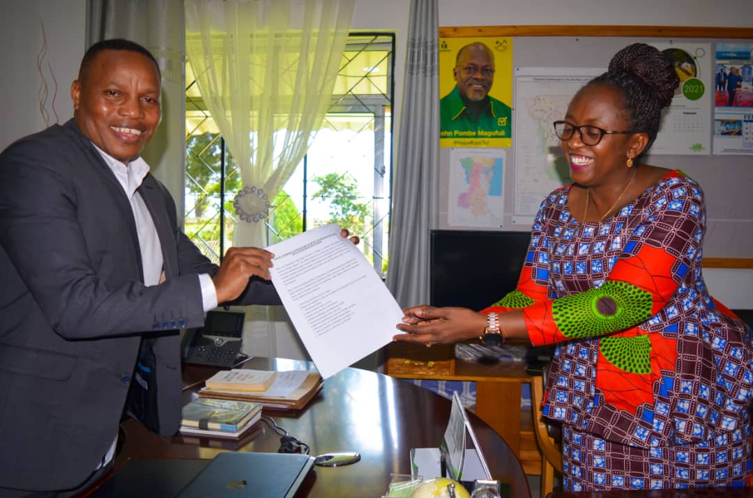 Afisa Mtendaji Mkuu wa Mfuko wa Mawasiliano kwa Wote (UCSAF), Justina Mashiba akikabidhi ripoti ya utekelezaji wa miradi ya Mfuko wa Mawasiliano kwa Wote aliyoisoma ofisini kwa Mkuu wa Mkoa wa Kagera, akipokea ripoti hiyo ni Mkuu wa Mkoa Brigedia Jenerali Marco Gaguti, Mkoani Kagera.