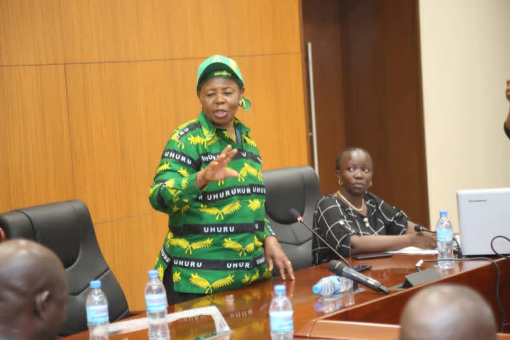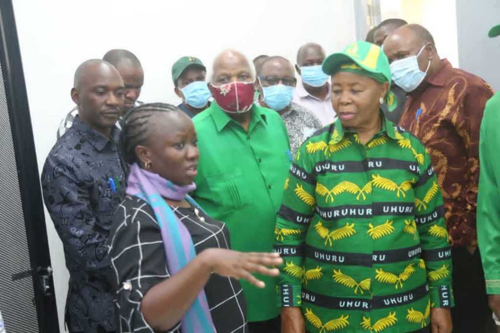 Mwenyekiti wa baraza la wadhamini la Chama Cha Mapinduzi (CCM) ,ANNA ABDALLAH aliyesimama akizungumza jambo ,wakati alipoambatana na wajumbe wa baraza hilo ,kwenda kutembelea na kujionea maendeleo ya ukamilishaji wa ujenzi wa Chuo cha uongozi na Itikadi cha Mwalimu Nyerere ,kilichopo Kwamfipa,Kibaha,mkoani Pwani, wa kwanza kulia aliyekaa ni Msimamizi wa mradi huo ,Emmanuela Kaganda