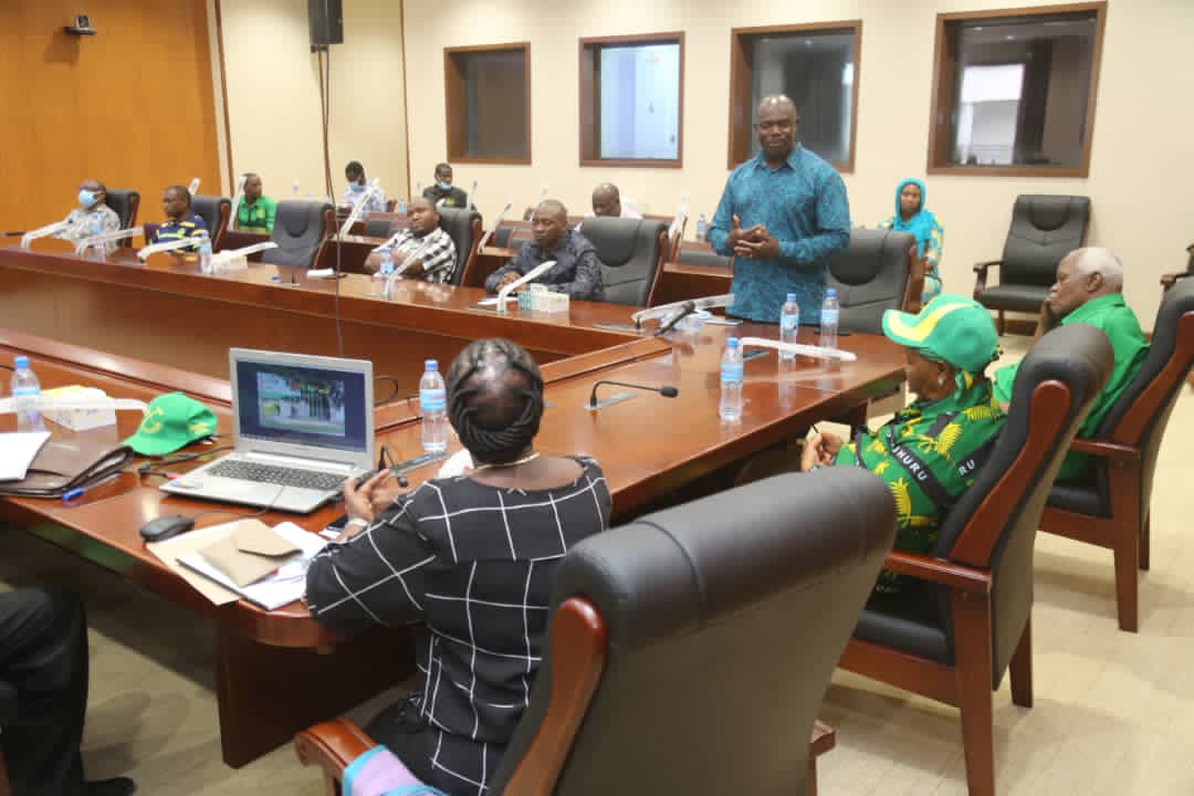 Naibu katibu mkuu wa CCM Bara ,Rodrick Mpogolo aliyesimama akitoa maelekezo ,wakati wajumbe wa baraza la wadhamini la CCM walipokwenda kutembelea na kujionea maendeleo ya ukamilishaji wa ujenzi wa Chuo cha uongozi na Itikadi cha Mwalimu Nyerere ,kilichopo Kwamfipa,Kibaha,mkoani Pwani.