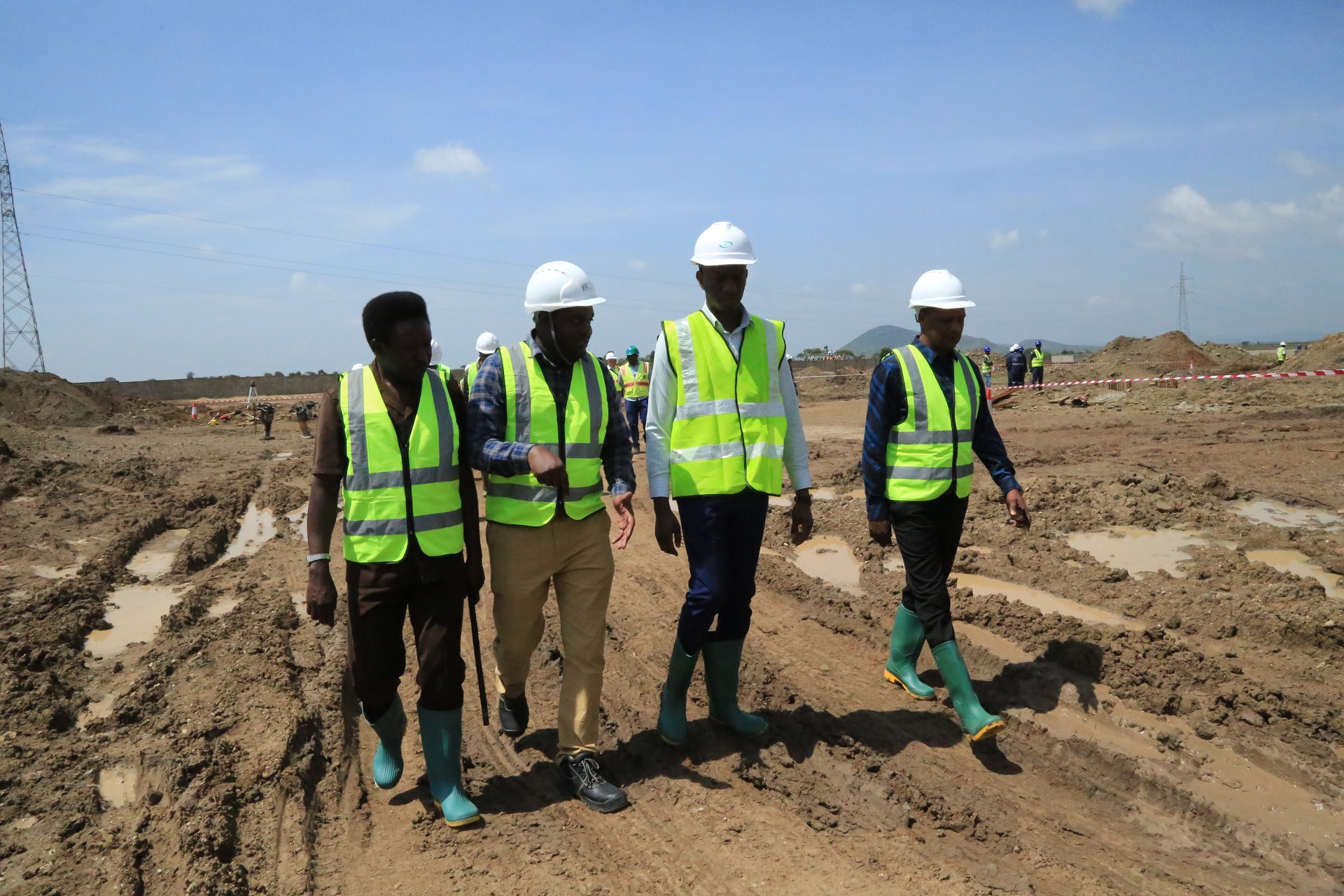 Naibu Waziri wa Nishati, Stephen Byabato (pili kulia) akipita kukagua Ujenzi wa Kituo cha Kupoza Umeme wa Kilovolts 400 cha Lemuguru kilichopo wilayani Arumeru mkoani Arusha, wakati wa ziara yake ya kikazi mkoani humo, Februari 17, 2021.