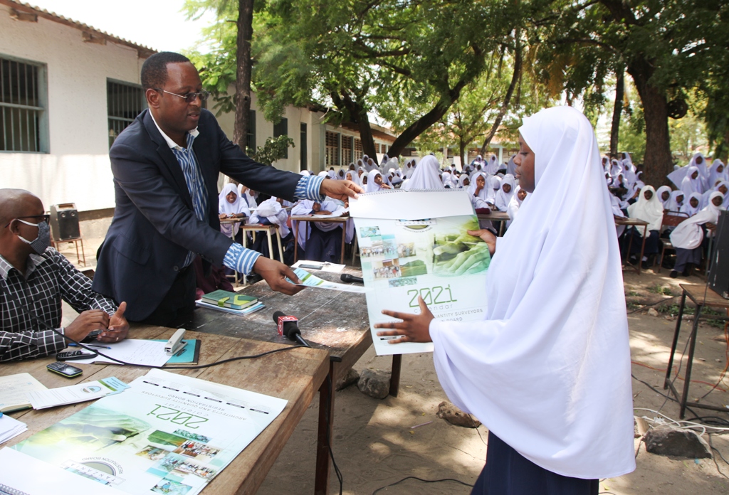 Afisa Mafunzo Mkuu wa AQRB, Daniel Matondo (katikati) akimkabidhi zawadi ya kalenda ya taasisi hiyo mmoja wa wanafunzi waliojibu maswali katika hafla hiyo. |