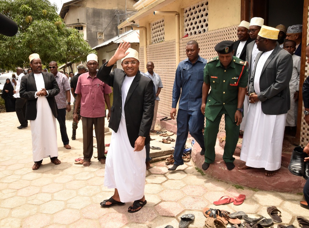 RAIS wa Zanzibar na Mwenyekiti wa Baraza la Mapinduzi Alhajj Dk. Hussein Ali Mwinyi akiitikia dua ikisomwa na Mufti Mkuu wa Zanzibar Sheikh. Saleh Omar Kabi (kulia kwa Rais) baada ya kumalizika kwa Sala ya Ijumaa iliofanyika katika Msikiti wa Miembeni Wilaya ya Mjini Unguja na (kushoto kwa Rais) Mkuu wa Mkoa wa Mjini Magharibi Unguja Mhe. Idrisa Mustafa Kitwana.(Picha na Ikulu)