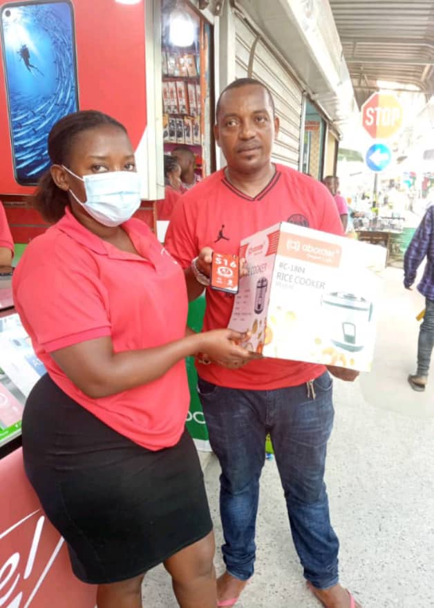Msimamizi wa duka la itel Kariakoo Jijini DSM Bi. Dotto akimkabidhi zawadi ya ricecooker mshindi wa Droo ya kwanza Bw. Zawadi.