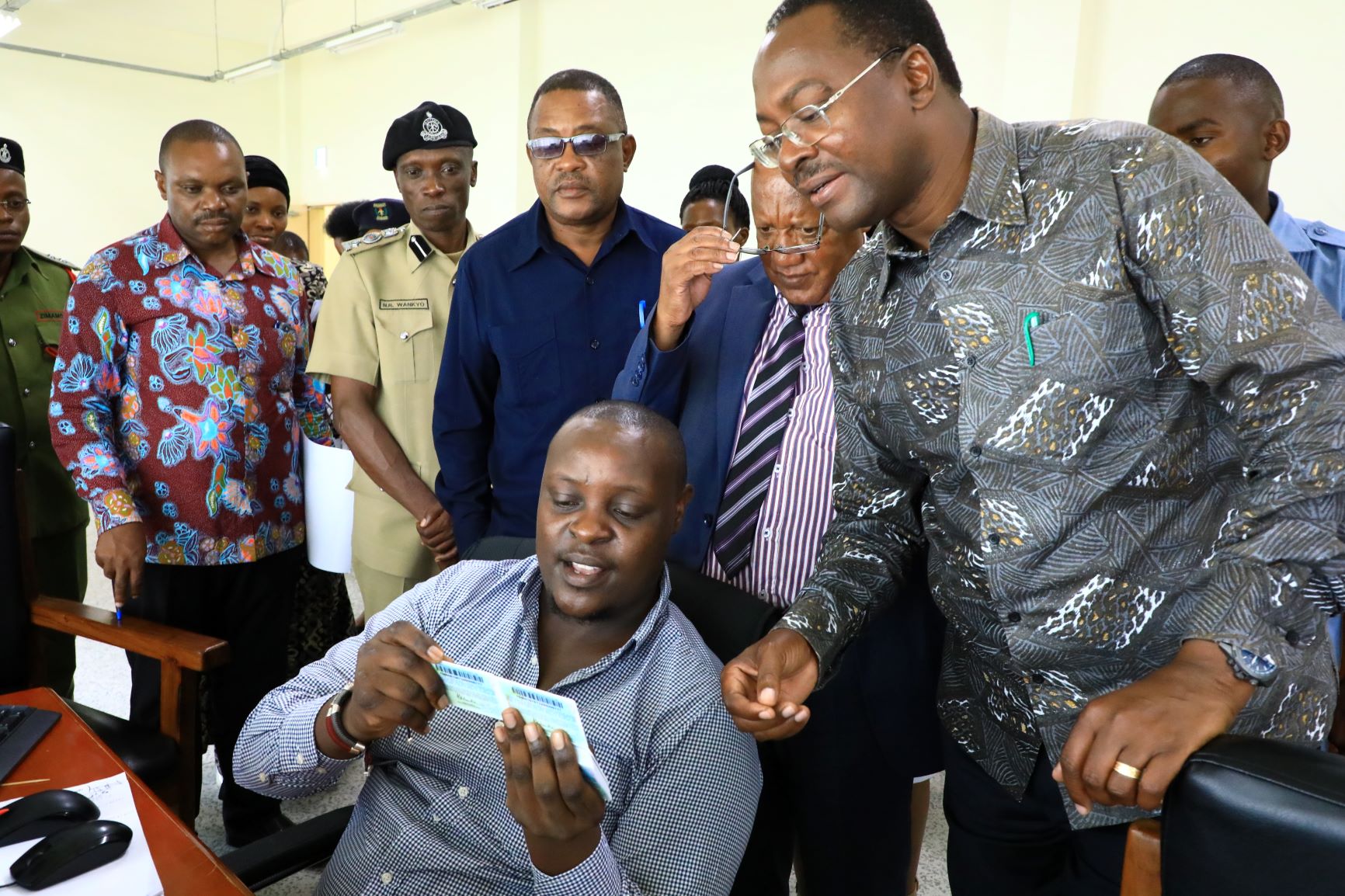 Waziri wa Mambo ya Ndani ya Nchi, George Simbachawene (kulia), akiangalia kitambulisho kilichokamilika baada ya kuhakikiwa katika Kitengo cha kuhakiki ubora wa kadi zilizozalishwa na Mamlaka ya Vitambulisho vya Taifa (NIDA), Mjini Kibaha, Mkoani Pwani, leo. Simbachawene alitembelea Kituo cha Kanzidata cha NIDA na amesema kuwa, wananchi wote waliotambuliwa na kupewa namba ambao ni zaidi ya Milioni 12, ifikapo mwezi Julai Mwaka huu watakuwa wamepata vitambulisho vyao. Wapili kulia ni Mkurugenzi Mkuu wa NIDA, Dk. Anorld Kihaule.