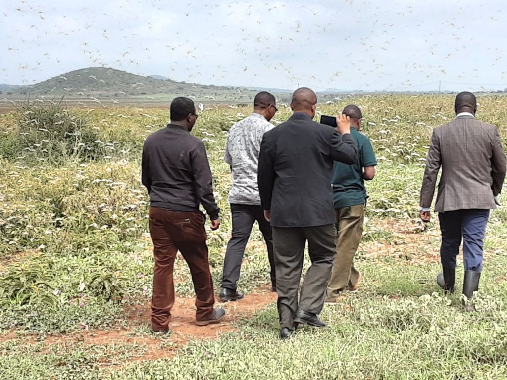 Waziri wa Kilimo Prof. Adolf Mkenda akipita kwenye kundi la nzige wa jangwani leo alipokagua maeneo ya Siha kufuatia uvamizi wa wadudu hao ambapo ameagiza ndege maalum kupita na kunyunyizia kiuatilifu mapema ili kuwaangamiza wote.