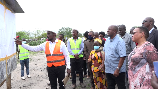Msimamizi wa Ujenzi wa Bwawa la Kunyweshea Mifugo la Chamakweza, Robert Baltazar akimuonesha michoro ya bwawa hilo, Naibu Waziri wa Mifugo na Uvuvi, Pauline Gekul (wa kwanza kulia) alipotembelea kukagua maendeleo ya ujenzi wa bwawa hilo lililopo Chalinze, Wilayani Bagamoyo, Mkoani Pwani Februari 24, 2021. Wa pili kutoka kulia ni Mkuu wa Mkoa wa Pwani, Mhandisi, Evarist Ndikilo.