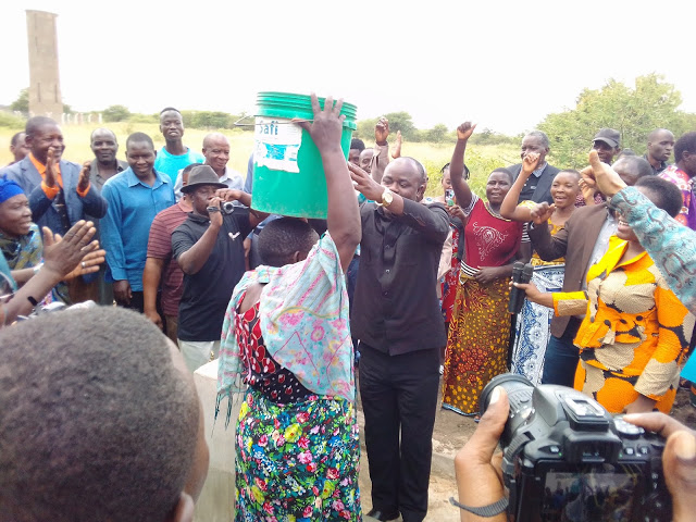 Mh.Waziri akimtwisha ndoo mmoja wa wananchi wa kijiji cha kashangu Halmashauri ya Itigi mara baada ya kuzindua mradi huo.