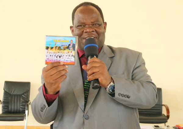 Askofu wa Kanisa la EAGT Ushirika Makimbilio Healing Center mjini Shinyanga, Raphael Machimu akionesha CD/DVD ya Wimbo Maalumu wa Picha uliopewa jina la Tanzania ya Amani kutoka Dynamic Choir EAGT Ushirika Shinyanga.