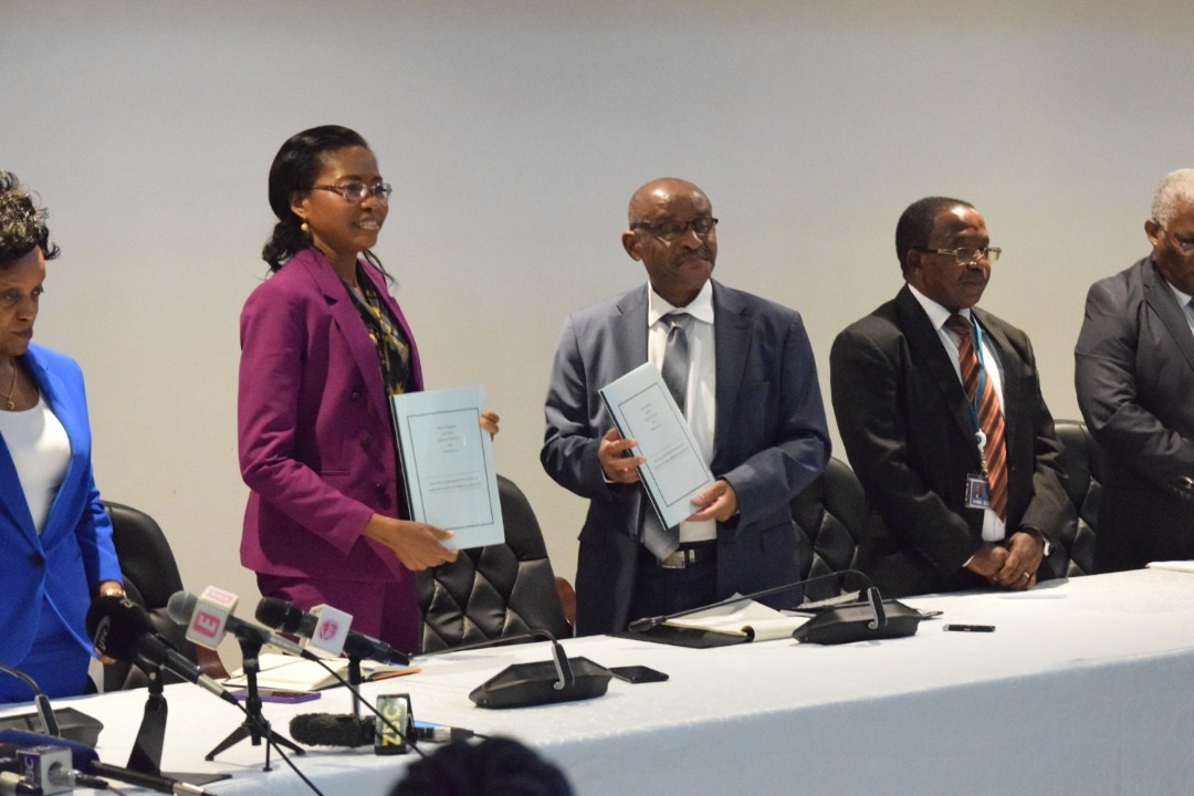 Gavana wa Benki Kuu ya Tanzania Prof.Florence Luaga na Mkurugenzi Mtendaji Mkuu wa Benki ya NMB Bi. Ruth Zaipuna wakionesha mikataba ya kuhamisha mali na madeni ya benki ya Biashara ya China na kuchukuliwa na Benki ya Taifa ya NMB.