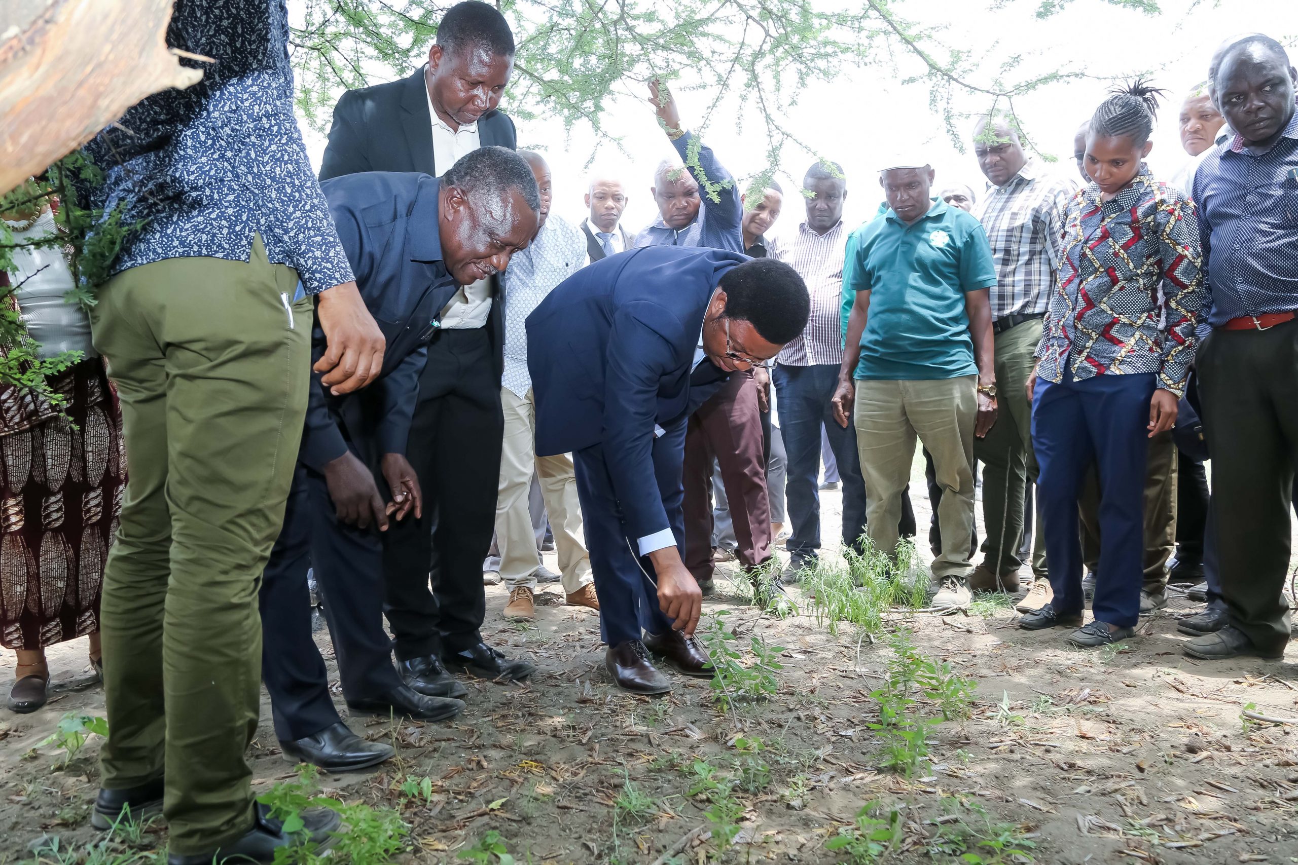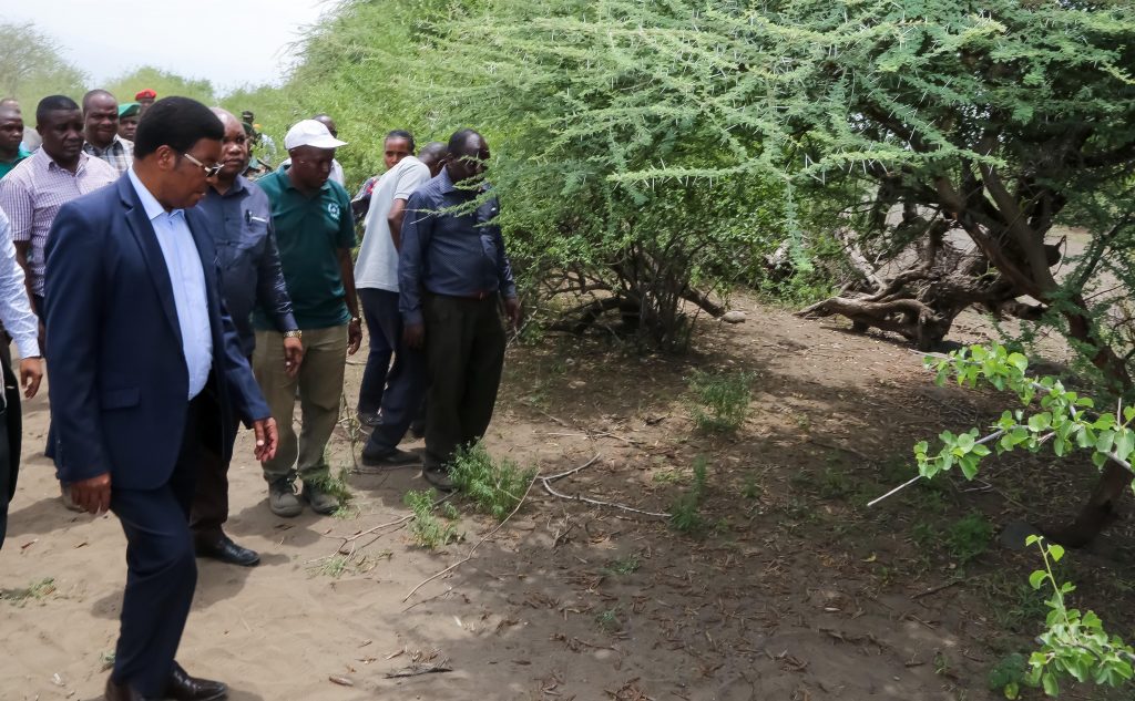 Waziri Mkuu Kassim Majaliwa akiangalia nzige walioteketezwa kwenye kijiji cha Engaruka, wilayani Monduli, mkoani Arusha, Machi 4, 2021.