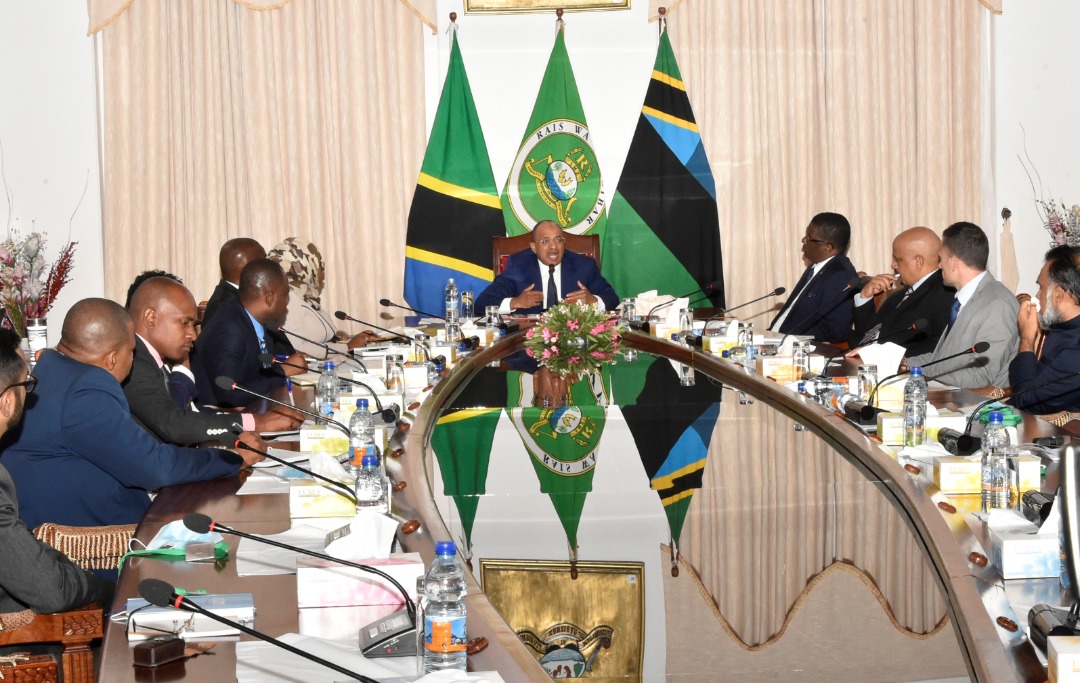 RAIS wa Zanzibar na Mwenyekiti wa Baraza la Mapinduzi Mhe.Dk. Hussein Ali Mwinyi akizungumza na Wafanyabiashara wanaoagiza bidhaa za Vyakula kutoka nje, akjisisitiza jambo wakati wa mkutano wake na wafanyabiashara uliofanyika katika ukumbi wa Ikulu Jijini Zanzibar na (kulia kwa Rais) Katibu wa Baraza la Mapinduzi na Katibu Mkuu Kiongozi Mhandisi Zena Ahmed Said na (kushoto kwa Rais) Waziri wa Biashara na Maendeleo ya Viwanda Zanzibar Mhe. Omar Said Shabaan.(Picha na Ikulu)