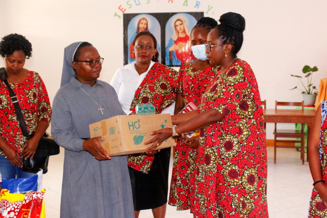 Baadhi ya watumishi wa Mfuko wa Mawasiliano kwa wote [UCSAF] wakiongozwa na Mtendaji Mkuu katika zoezi la kukabidhi vifaa kwa uongozi wa kituo. Kulia ni Mtendaji Mkuu wa UCSAF, Bi Justina Mashiba na kushoto ni Sr. Aurea Kyara mlezi wa watoto kituoni hapo.