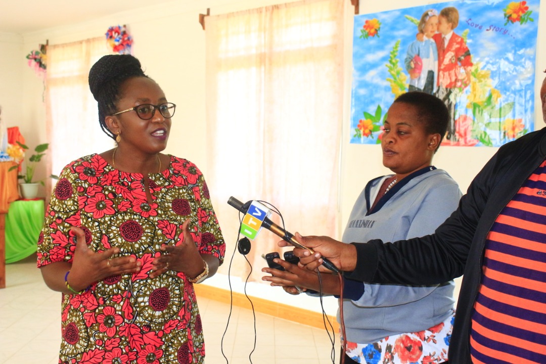 Mtendaji Mkuu wa Mfuko wa Mawasiliano kwa Wote, Bi. Justina Mashiba [kulia] akizunguza na waandishi wa Habari mara baada ya kukabidhi vifaa hivyo kwa uongozi wa kituo.