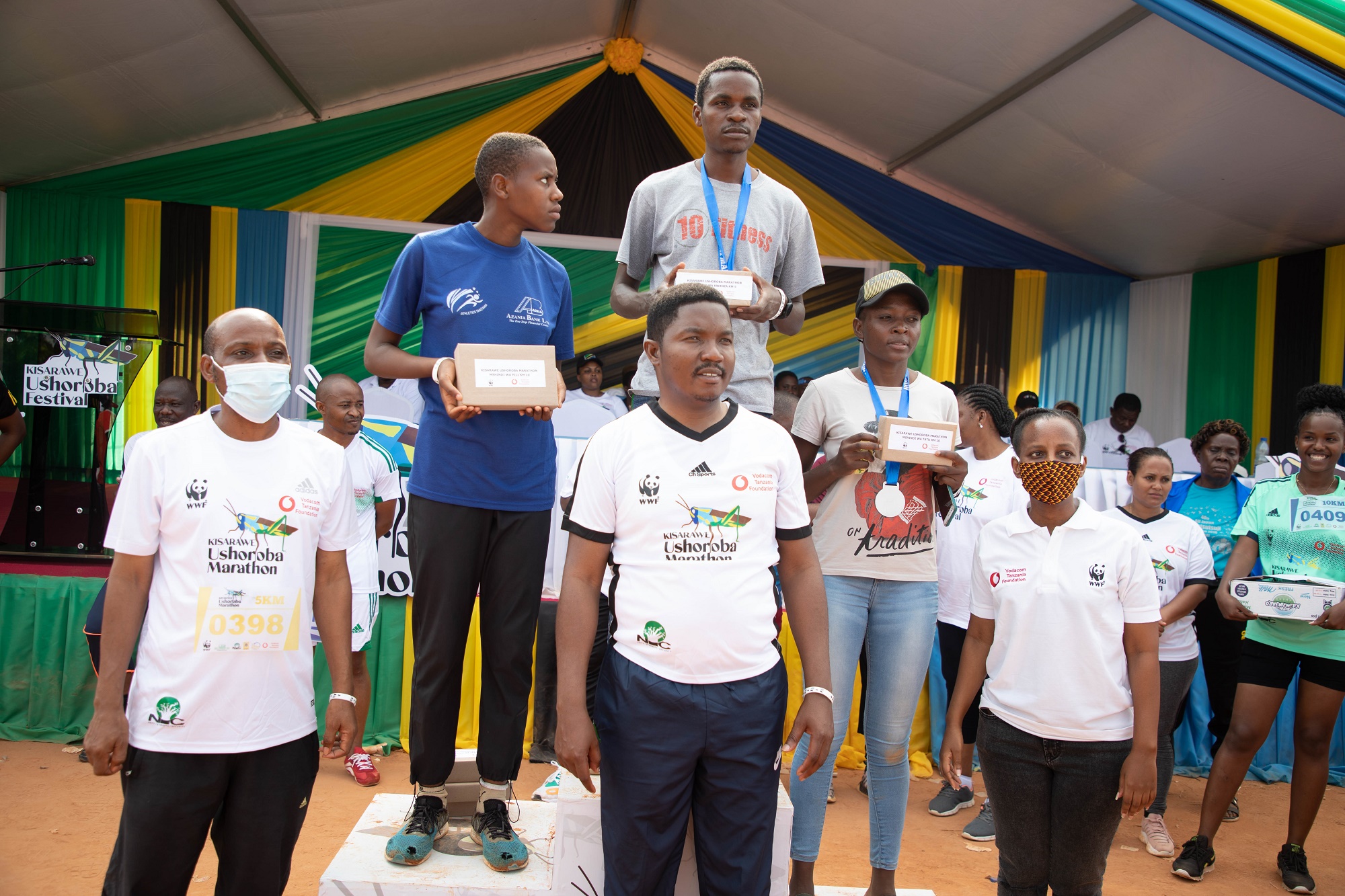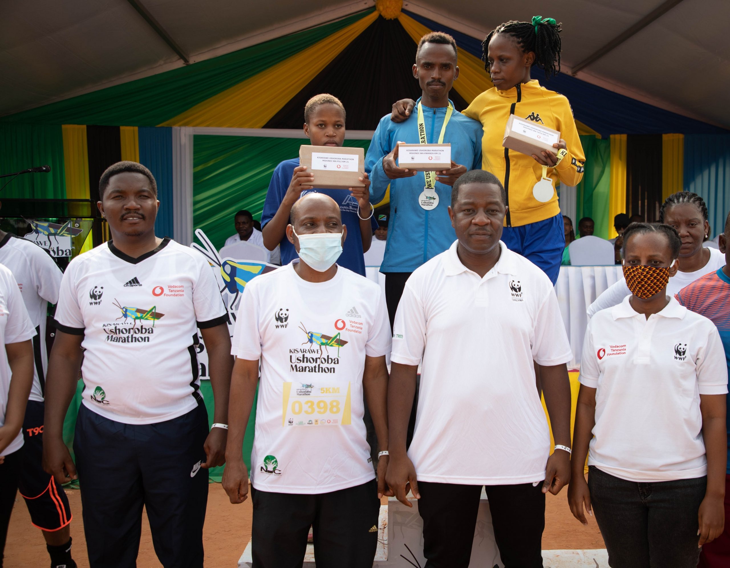 Washindi wa kilomita 10 mbio za Kisarawe Ushoroba Marathon wakiwa kwenye picha ya pamoja na Waziri wa TAMISEMI, Mhe. Suleiman Jafo, Meneja wa Vodacom Tanzania Foundation, Sandra Oswald na Mhifadhi Mazingira WWF, Severin Kalonga