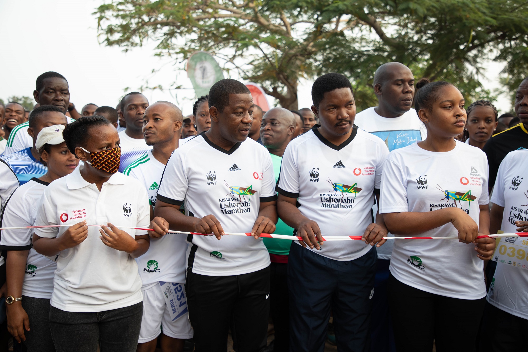 Waziri wa TAMISEMI, Mhe. Suleiman Jafo (kushoto ), Naibu waziri Habari, Utamaduni, Sanaa na Michezo, Mhe. Abdallah Ulega (ambaye alikuwa mgeni rasmi ), Meneja wa Vodacom Tanzania Foundation, Sandra Oswald, na Mhifadhi Mazingira kutoka WWF, Dkt. Severin Kalonga wakiwa kwenye picha ya pamoja na washindi wa jumla wa kilomita 21 mbio za Kisarawe Ushoroba Marathon 2021 Omary Maulidi (katikati ) , Rebecca Machege (kushoto ) na Grace Charles. Mbio hizo zilifanyika wilayani Kisarawe jana. Vodacom ilidhamini mbio hizo zenye lengo la kudhibiti mabadiliko ya tabia nchi kupitia upandaji miti na utunzaji wa mazingira.
