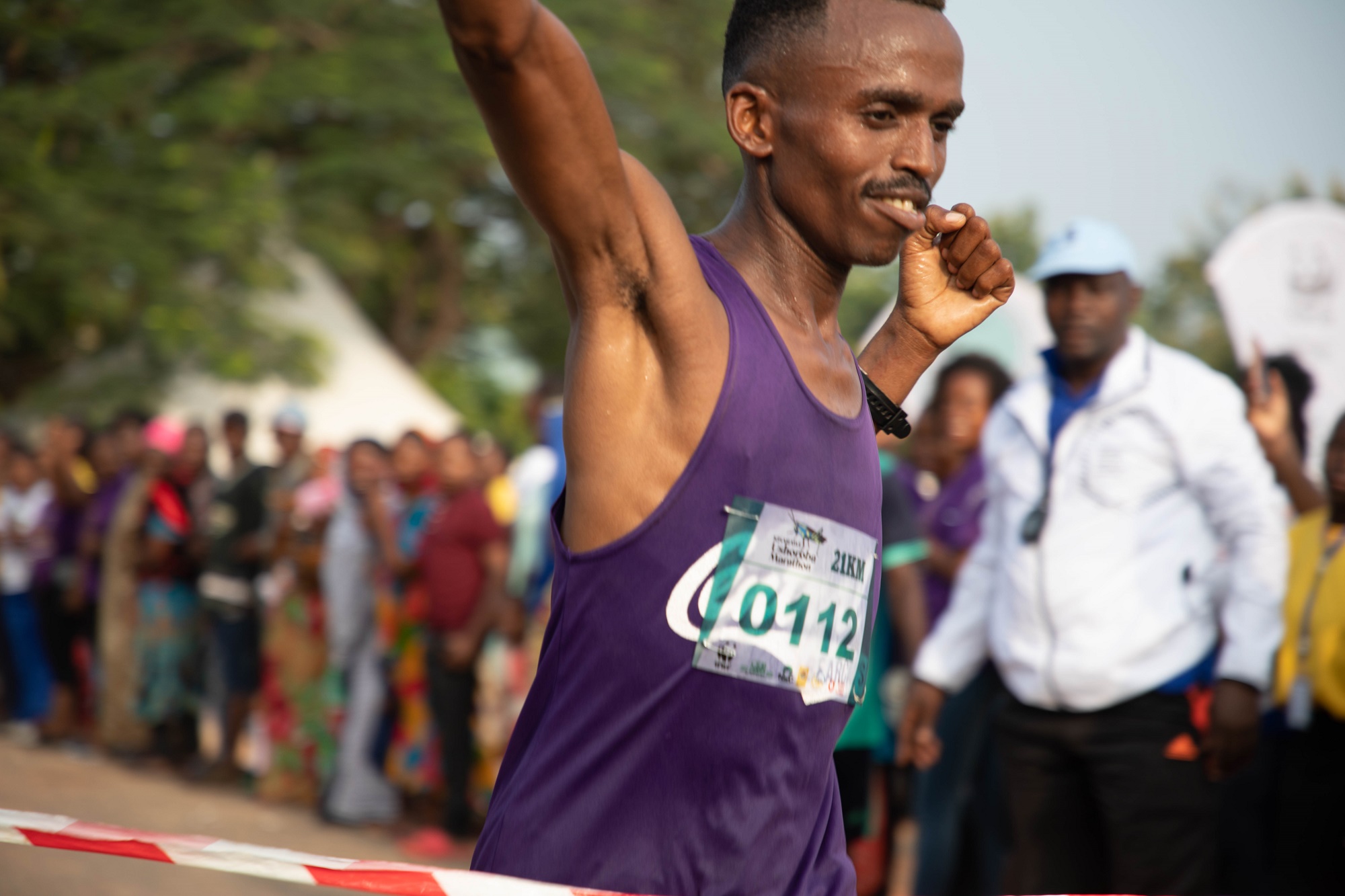 Mshindi wa mbio za Kisarawe Ushoroba Marathon 2021 kwa kilomita 21 wanaume, Omary Maulidi wa Dar es Salaam akimaliza mbio hizo kwa kutumia muda wa saa 1:12.