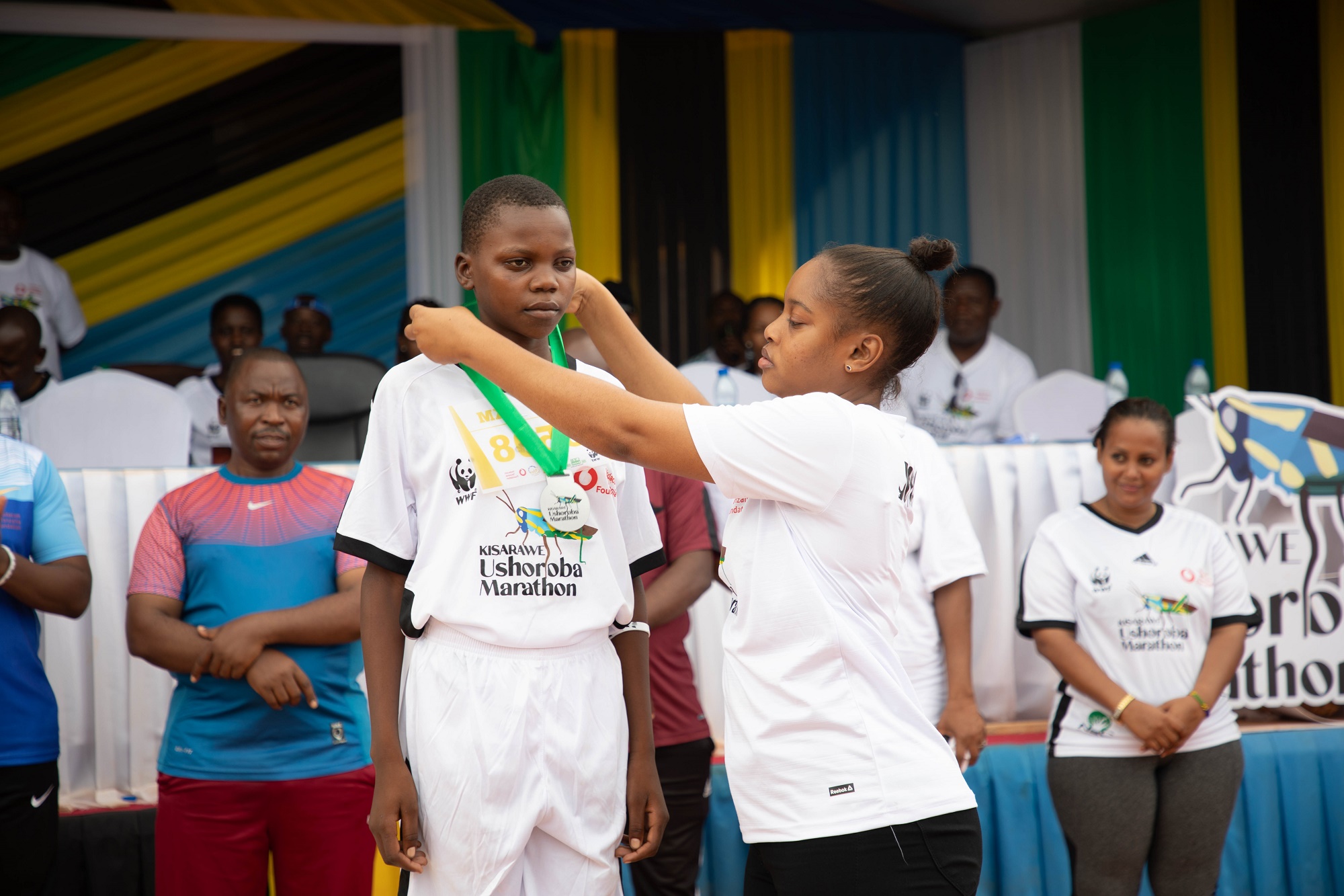 Mkuu wa wilaya ya Kisarawe, Mhe. Jokate Mwegelo akimvisha medali mshindi wa kwanza wanawake kilomita 5, Assumpta Lameck