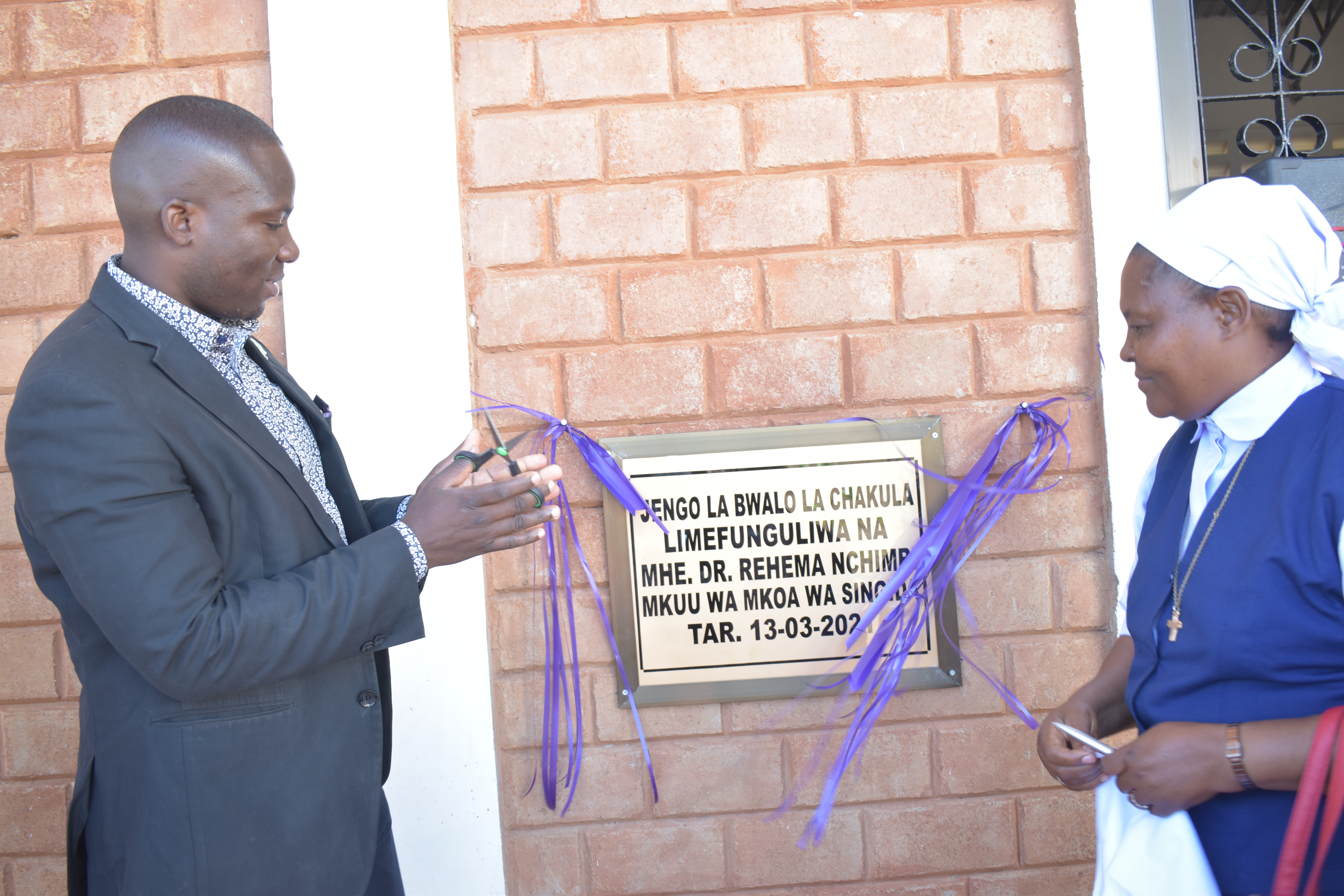 Kaimu Afisa Vijana Mkoa wa Singida, Frederick Ndahani (kushoto) akifungua pazia kuashiria uzinduzi wa jengo la Utawala la Shule ya Awali na Msingi ya Genezareth iliyopo Manispaa ya Singida mwishoni mwa wiki. Kulia ni Meneja wa shule hiyo, Sister Yohana Duwe.