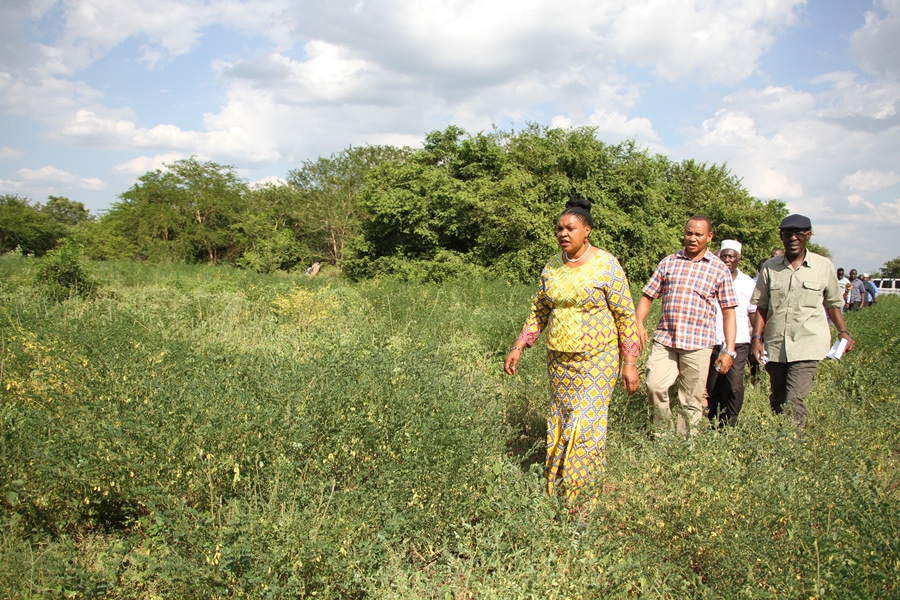 Waziri wa Nchi Ofisi ya Waziri Mkuu (Sera, Uratibu, Bunge, Kazi, Vijana, Ajira na Wenye Ulemavu), Mhe. Jenista Mhagama akikagua eneo la shamba la Mkulazi lililopo eneo la Mkulazi, Morogoro vijijini. Shamba hilo linaloendeshwa na Kampuni Hodhi ya Mkulazi linatekelezwa kupitia mradi wa Mkulazi Estate, unaotarajiwa kuzalisha tani 200,000 za sukari.