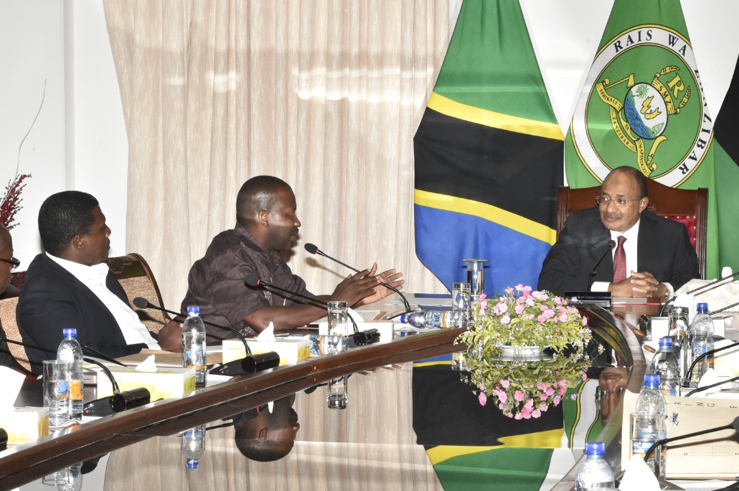 RAIS wa Zanzibar na Mwenyekiti wa Baraza la Mapinduzi Mhe.Dk. Hussein Ali Mwinyi akimsikiliza Mwenyekiti wa Jumuiya ya Watembeza Watalii Zanzibar (ZATO) Bw. Hassan Ali Mzee, akjitowa maelezo ya Jumuiya yao wakati wa mkutano wao na Rais ikiwa ni muendelezo wa mikutano yake na Sekta mbalimbali za Wafanyabiashara Zanzibar uliofanyika katika ukumbi wa Ikulu Jijini Zanzibar.(Picha na Ikulu)