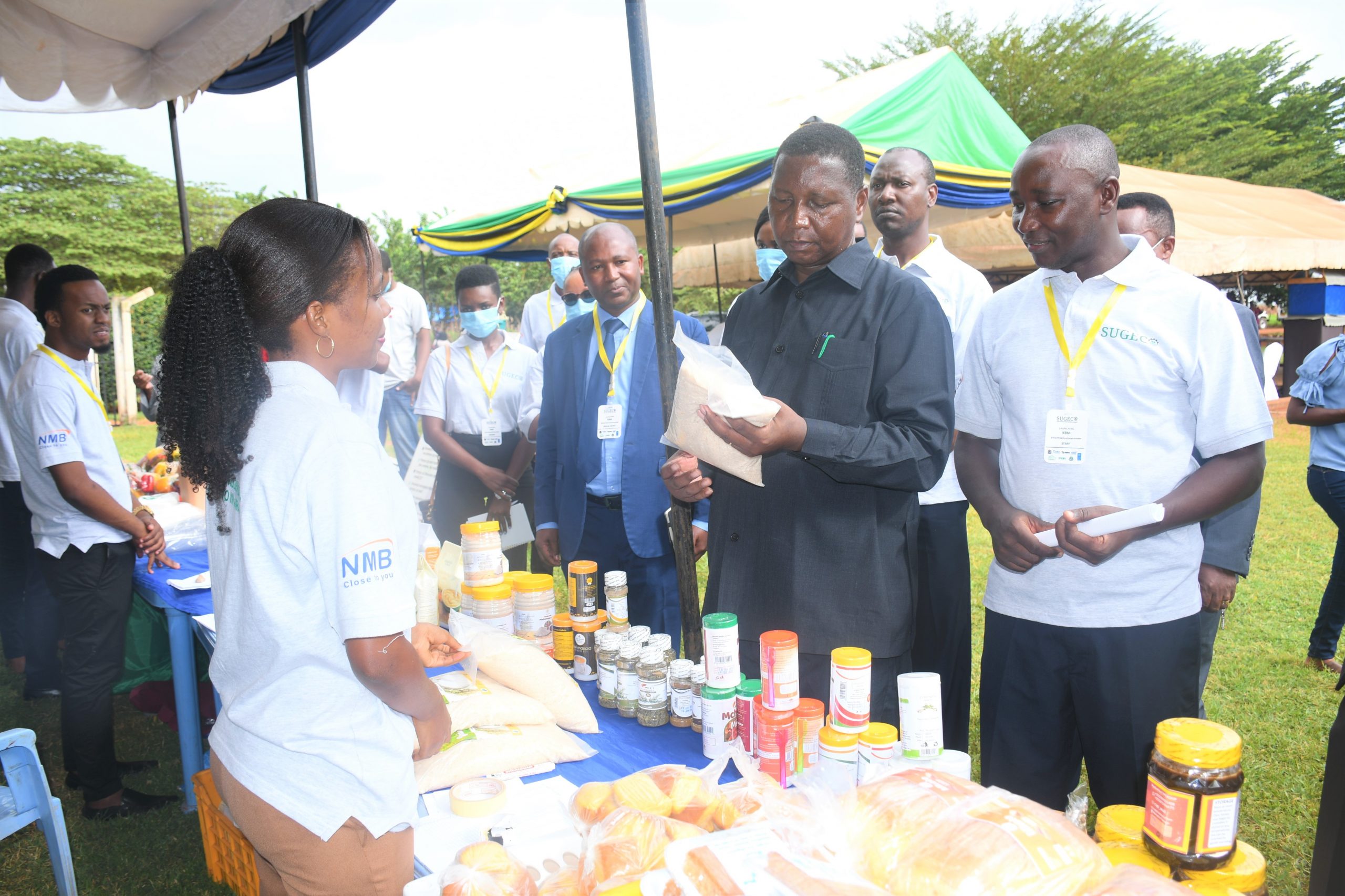 Waziri wa Kilimo Prof.Adolf Mkenda akitazama bidhaa inayotengezwa na mjasiliamali Fatma Mbaga (kushoto) chini ya usimamizi wa SUGECO ikiwa ni mkakati wa kukuza biashara ya kuongeza thamani ya mazao ya kilimo.Kulia ni Mkurugenzi Mtendaji SUGECO Revocatus Kimario.