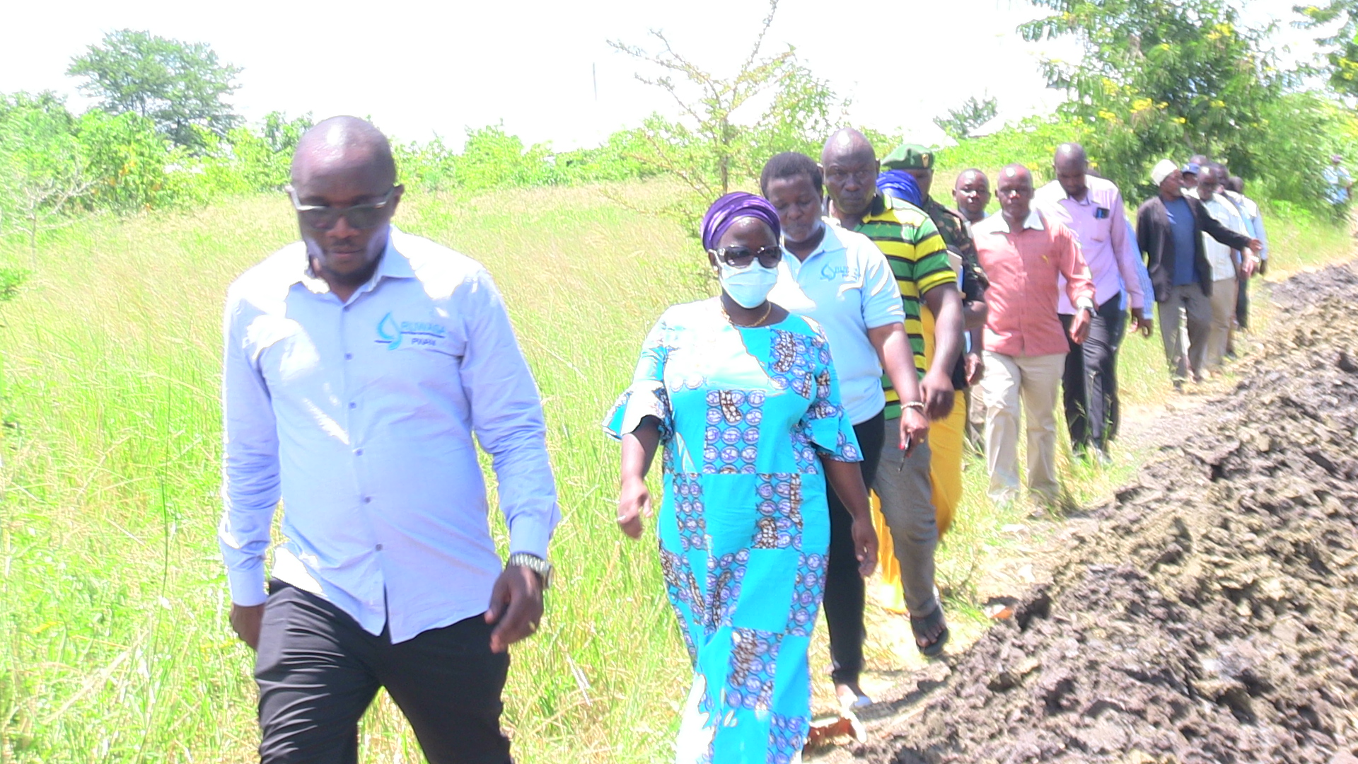 Meneja wa Ruwasa Wilaya ya Bagamoyo Injinia James Kionaumela wa kwanza akiwa katika msafara wa miguu akiwa ameambatana na Mkuu wa Wilaya ya Bagamoyo Zainabu Kawawa wa pili yake pamoja na viongozi wengine wa Ruwasa pamojana na halmashauri kwa ajili ya kwenda kujionea utekelezaji wa miradi ya maji mbali mbali pamoja na mitaro inayochimbwa ili kutandaza mabomba.