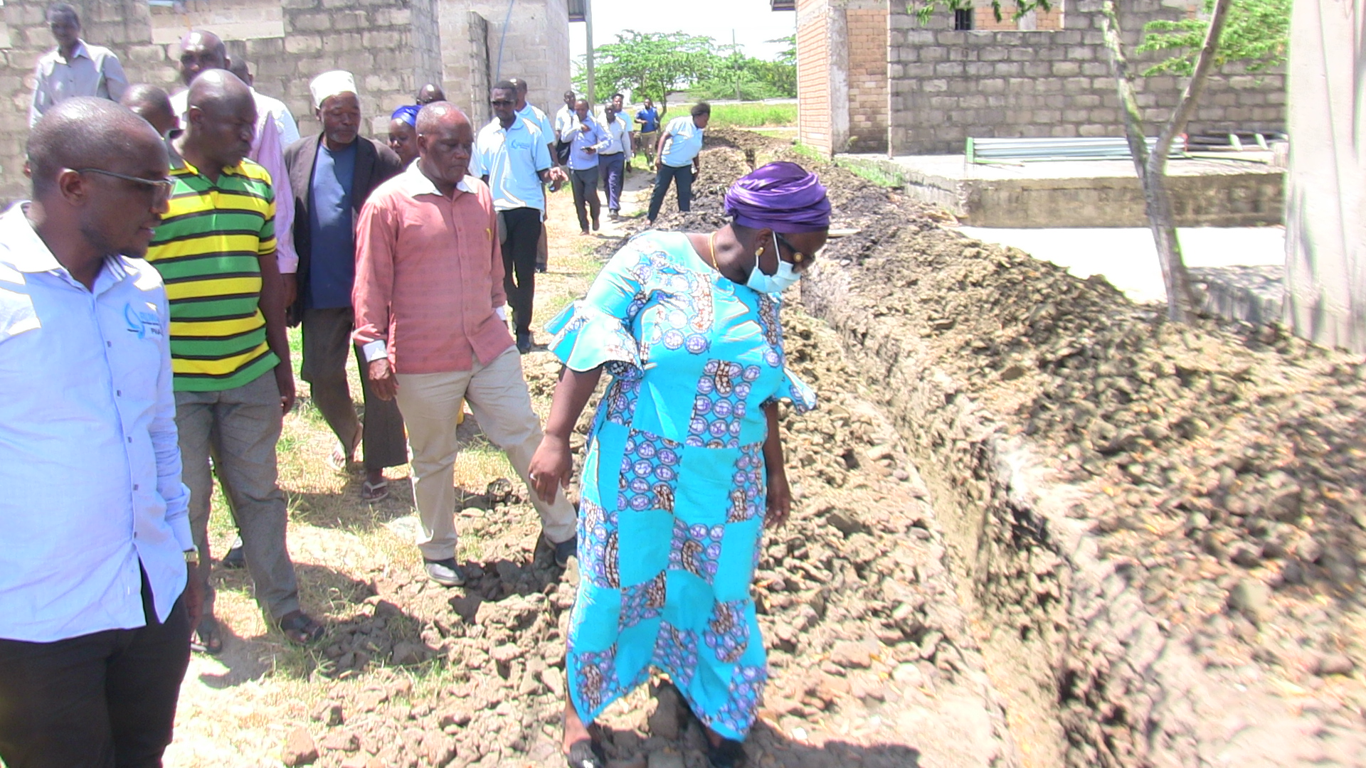 i Mkuu wa Wilaya ya Bagamoyo wa kulia Zainabu Kawawa akiwa anaangalia ujenzi wa mtaro ambao umechimbwa maalumu kwa ajili ya utekelezaji wa ulazaji wa mabomba kwa ajili ya utekelezaji wa mradi huo ambao utawanufaisha wananchi mbali mbali.