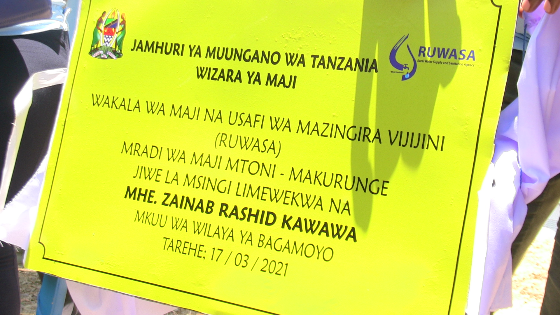 Muonekano wa Kibao ambacho kiliandaliwa maalumu kwa ajili ya uwekaji wa jiwe la msingi katika mradi huo wa maji katika kitongoji cha Mtoni kata ya Makurunge ambapo sherehe za uwekaji wa jiwe hilo limefanywa na Mkuu wa Wilaya ya Bagamoyo.(PICHA ZOTE NA VICTOR MASANGU)