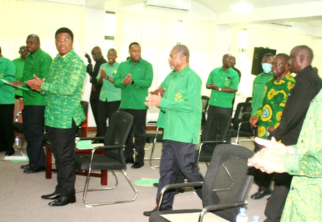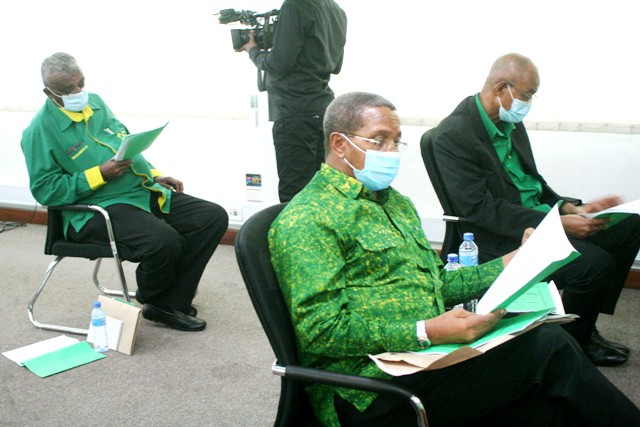 Mwenyekiti wa CCM na Rais Mstaafu Dk. Jakaya Kikwete akiwa kwenye kikao hicho. Wapili ni Rais Mstaafu wa Zanzibar Dk. Amani Abeid Karume.