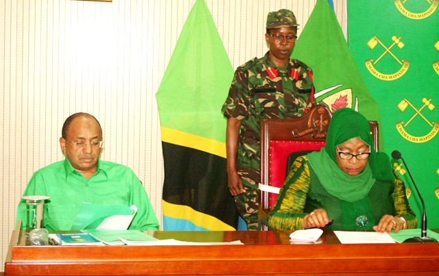 Wajumbe Dk. Jakaya Kikwete na Amani Abeid Karume wakipitia makabrasha wakati wa kikao hicho. Nyuma yao ni Dk. John Mndolwa Mwenyekiti wa Jumuiya ya Wazazi Tanzania.