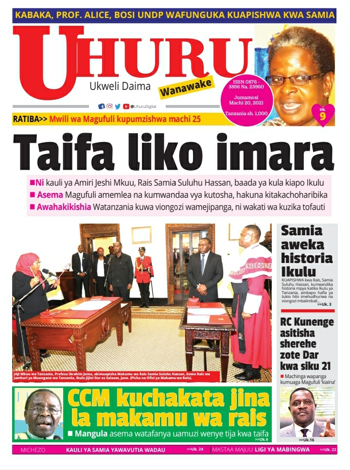 MagazetiPITIA VICHWA VYA HABARI KATIKA MAGAZETI YA LEO MARCH 20,2021 Last updated: 2021/03/20 at 3:33 AM Alex Sonna 5 years ago Share SHARE Alex Sonna March 20, 2021 March 20, 2021 Share this Article Facebook Twitter Email Print Previous Article SHIRIKISHO LA VYAMA VYA WAFANYAKAZI TANZANIA (TUCTA) LAMLILIA HAYATI RAIS DK. MAGUFULI Next Article WALIMU ELIMU YA AWALI WAONGEZA MBINU ZA UFUNDISHAJI NA UJIFUNZAJI DARASA LA AWALI KWA ASILIMIA 70