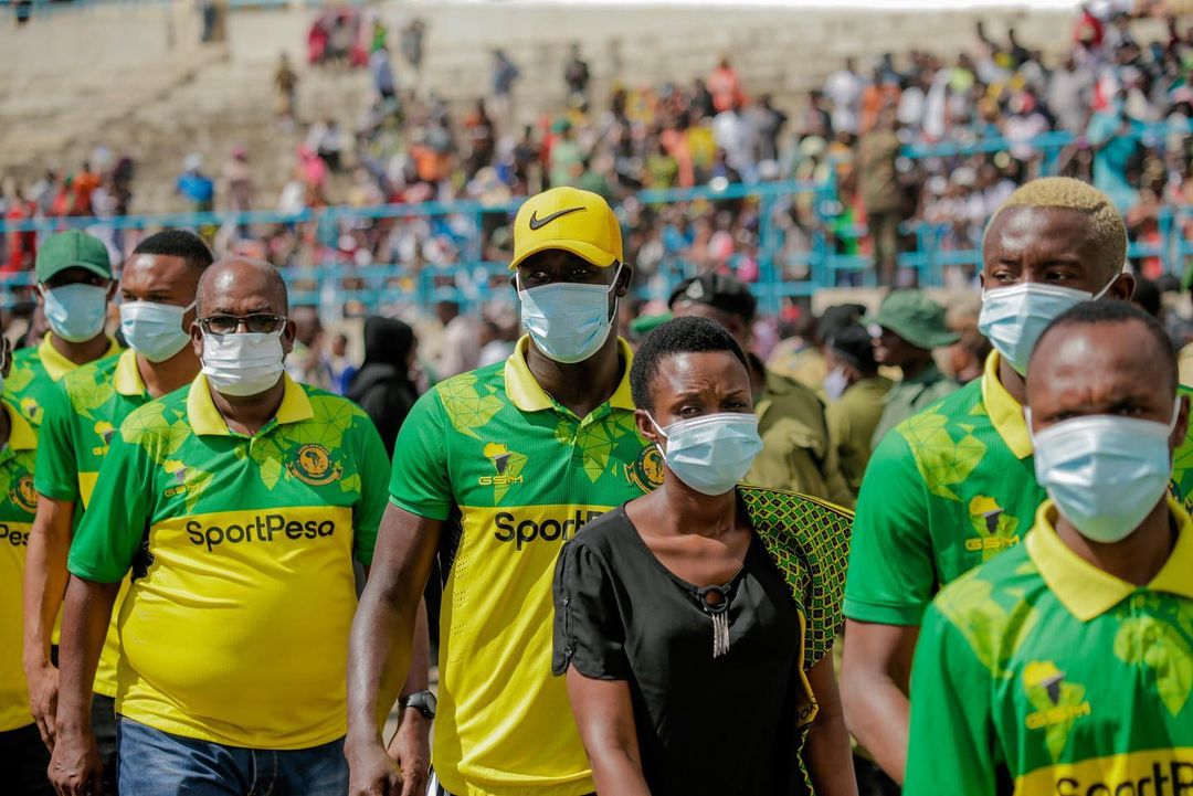 KIUNGO mshambuliaji wa kimataifa wa Burundi, Abdul Razak Fiston akiwoangoza wachezaji wenzake na Maafisa mbalimbali kwenda kuuaga mwili wa aliyekuwa Rais wa Jamhuri ya Muungano wa Tanzania, Dk. John Pombe Joseph Magufuli aliyefariki dunia Machi 17, mwaka huu leo uwanja wa Uhuru Jijini Dar es Salaam