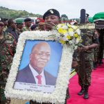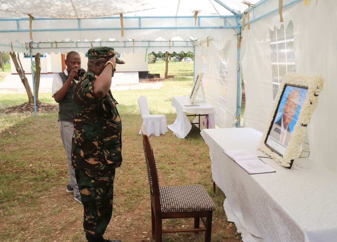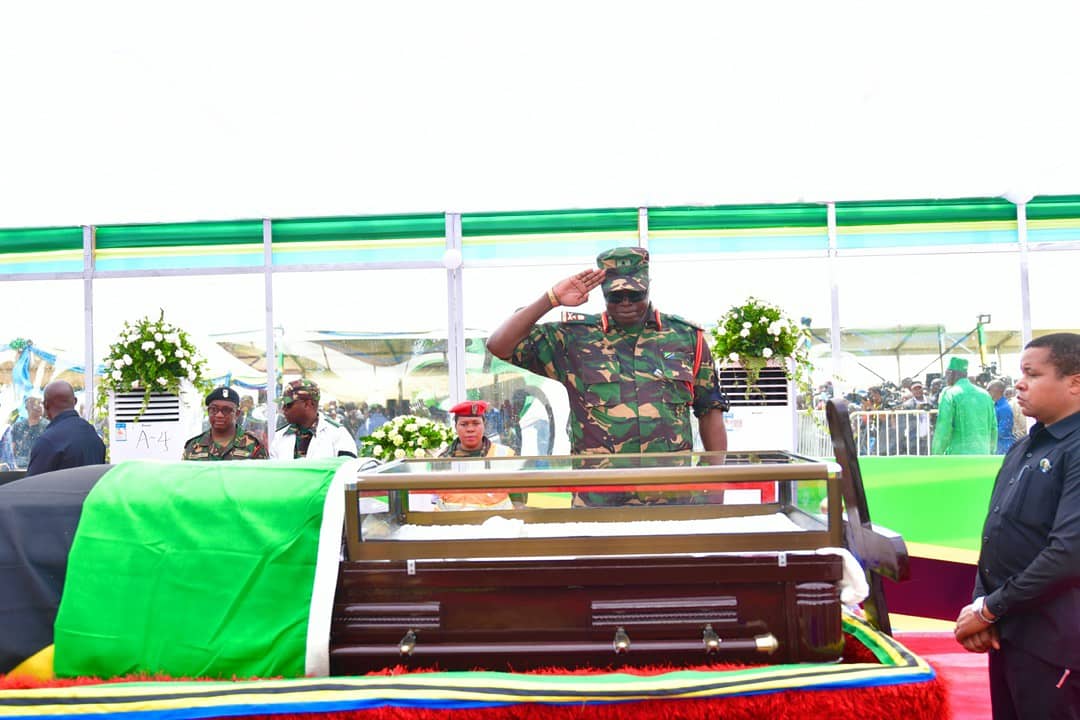 Katibu Mkuu Wizara ya Mambo ya Nje na Ushirikiano wa Afrika Mashariki, Balozi Brigedia Jenerali Wilbert Ibuge akitoa heshima za mwisho kwa mwili wa aliyekuwa Rais wa Tano wa Jamhuri ya Muungano wa Tanzania Hayati Dkt. John Pombe Magufuli Chato mkoani Geita