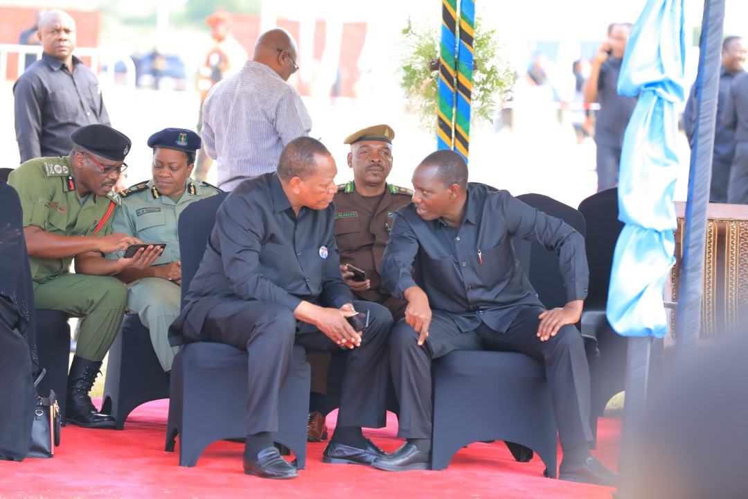 Katibu Mkuu Kiongozi Balozi Dkt. Bashiru Ally akiteta jambo na Waziri wa Mambo ya Nje na Ushirikiano wa Afrika Mashariki, Prof. Palamagamba John Kabudi (Mb) katika uwanja wa Magufuli wakati wa zoezi la kuaga mwili wa aliyekuwa Rais wa Tano wa Jamhuri ya Muungano wa Tanzania Hayati Dkt. John Pombe Magufuli Chato mkoani Geita