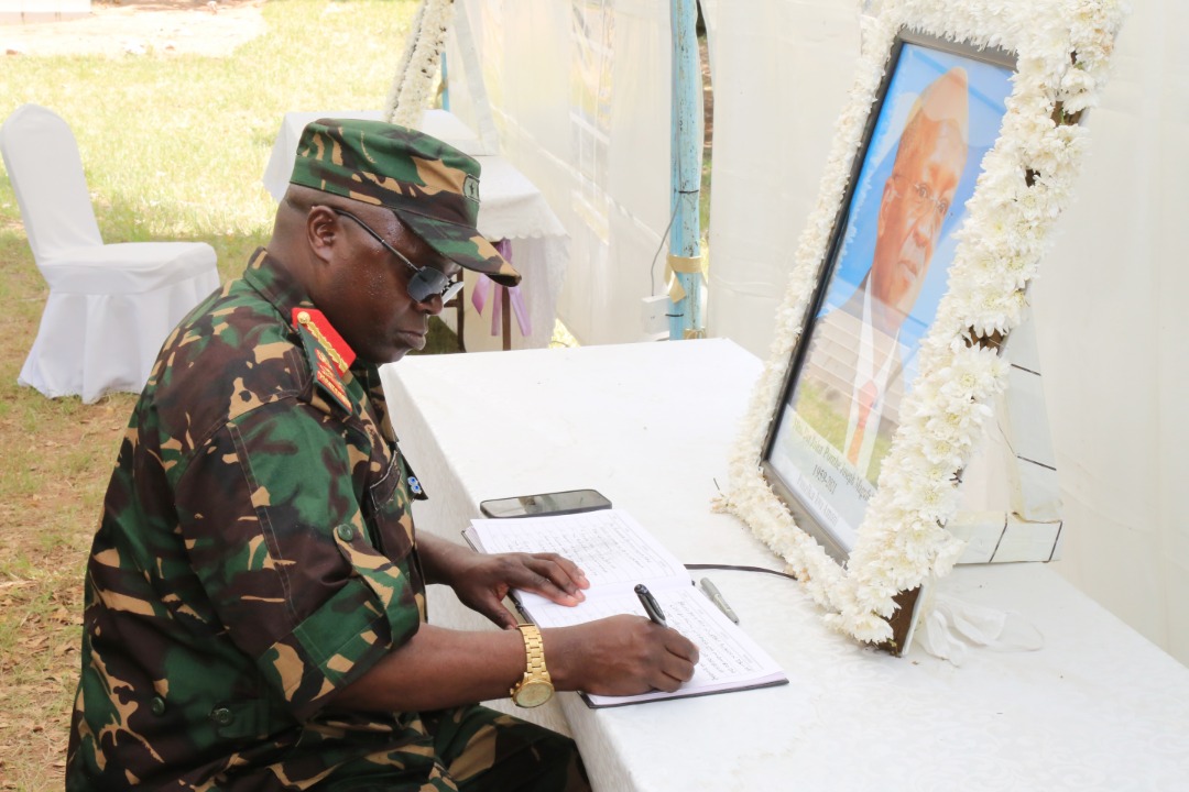 Katibu Mkuu Wizara ya Mambo ya Nje na Ushirikiano wa Afrika Mashariki, Balozi Brigedia Jenerali Wilbert Ibuge akisaini kitabu cha maombolezo katika viwanja vya Ofisi ya Mkuu wa Wilaya ya Chato kufuatia kifo cha aliyekuwa Rais wa Tano wa Jamhuri ya Muungano wa Tanzania Hayati Dkt. John Pombe Magufuli Chato mkoani Geita