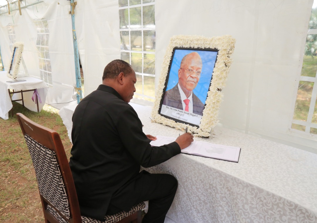 Waziri wa Mambo ya Nje na Ushirikiano wa Afrika Mashariki, Prof. Palamagamba John Kabudi (Mb) akisaini kitabu cha maombolezo katika viwanja vya Ofisi ya Mkuu wa Wilaya ya Chato kufuatia kifo cha aliyekuwa Rais wa Tano wa Jamhuri ya Muungano wa Tanzania Hayati Dkt. John Pombe Magufuli Chato mkoani Geita