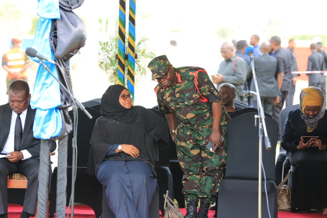 Katibu wa Baraza la Mapinduzi na Katibu Mkuu Kiongozi-Zanzibar, Mhandisi Zena Ahmed Said akiteta jambo na Katibu Mkuu Wizara ya Mambo ya Nje na Ushirikiano wa Afrika Mashariki, Balozi Brigedia Jenerali Wilbert Ibuge katika uwanja wa Magufuli wakati wa zoezi la kuaga mwili wa aliyekuwa Rais wa Tano wa Jamhuri ya Muungano wa Tanzania Hayati Dkt. John Pombe Magufuli Chato mkoani Geita