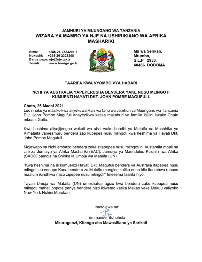 MchanganyikoNCHI YA AUSTRALIA YAPEPERUSHA BENDERA YAKE NUSU MLINGOTI KUMUENZI HAYATI DKT.JOHN POMBE NAGUFULI Last updated: 2021/03/27 at 7:33 AM joseph 5 years ago Share The Australian flag at half mast. Photo: Blainey Woodham / Daily News SHARE joseph March 27, 2021 March 27, 2021 Share this Article Facebook Twitter Email Print Previous Article PITIA VICHWA VYA HABARI KATIKA MAGAZETI YA LEO MARCH 27,2021 Next Article VIONGOZI 26 WA VIKUNDE VYA KUWEKA NA KUKOPA (CRP) WAPATIWA ELIMU