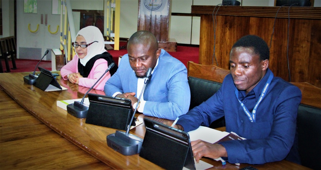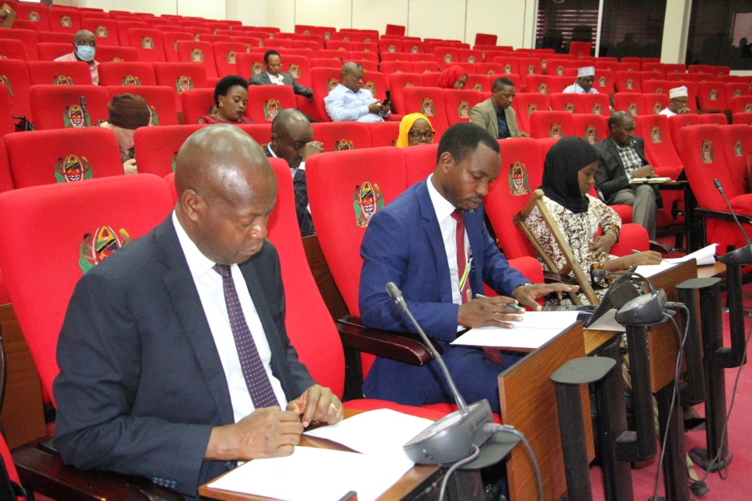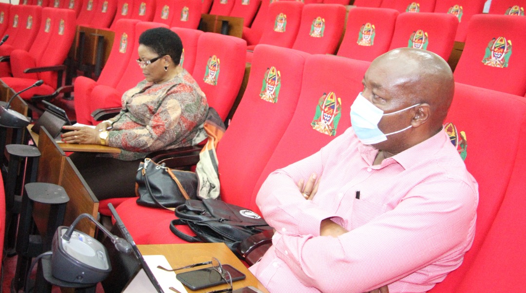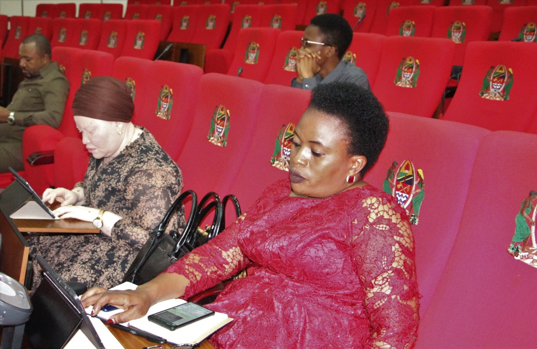 Manaibu Mawaziri Ofisi ya Waziri Mkuu; Naibu Waziri, (Kazi, Vijana na Ajira) Mhe. Patrobas Katambi, (katikati), Naibu Waziri (Wenye Ulemavu) Mhe. Ummy Ngeriananga (kulia) na Katibu Mkuu (Kazi, Vijana, Ajira na Wenye Ulemavu), Andrew Massawe wakifuatilia kikao cha Kamati ya Kudumu ya Bunge ya Katiba na Sheria na Wakala wa Usalama na Afya Mahali pa Kazi (OSHA), leo tarehe 29 Machi, jijini Dodoma.