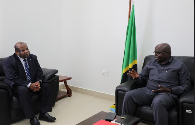 Katibu Mkuu wa Wizara ya Mambo ya Nje na Ushirikiano wa Afrika Mashariki Balozi Brigedia Jenerali Wilbert A. Ibuge na Mhe. Abdallah Abas Kilima Balozi wa Tanzania nchini Oman wakiwa kwenye mazumgumzo yaliyofanyika katika Ofisi za Wizara jijini Dodoma.